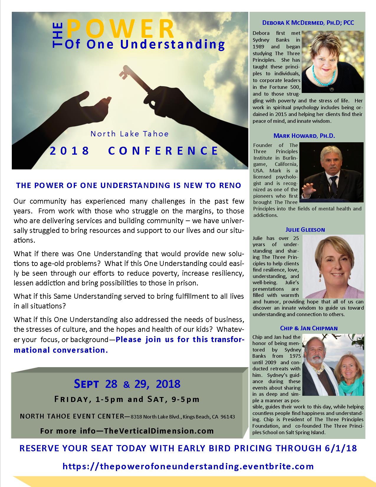 Follow your innate guidance system – trust the process – listen to your own inner wisdom in a healthy state of mind…Consider joining us in Lake Tahoe on September 28 & 29, 2018 for a day and one half conference, The Power of One Understanding with early bird pricing through 6/1/18.